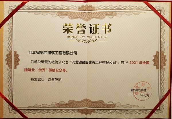 7月16日,在“2021建筑业微信公众号运维经验交流研讨会暨全国建筑业优秀公众号颁奖典礼”上,公司微信公众号“河北省第四建筑工程有限公司”被评为“2021年全国建筑业优秀微信公众号”。
